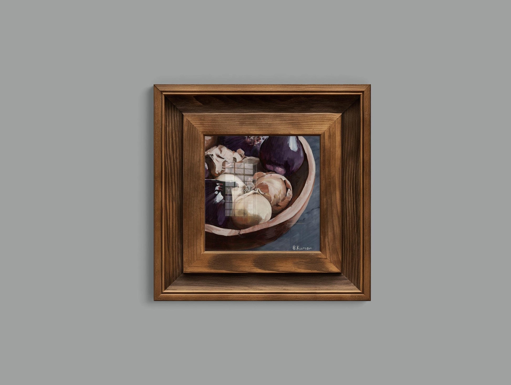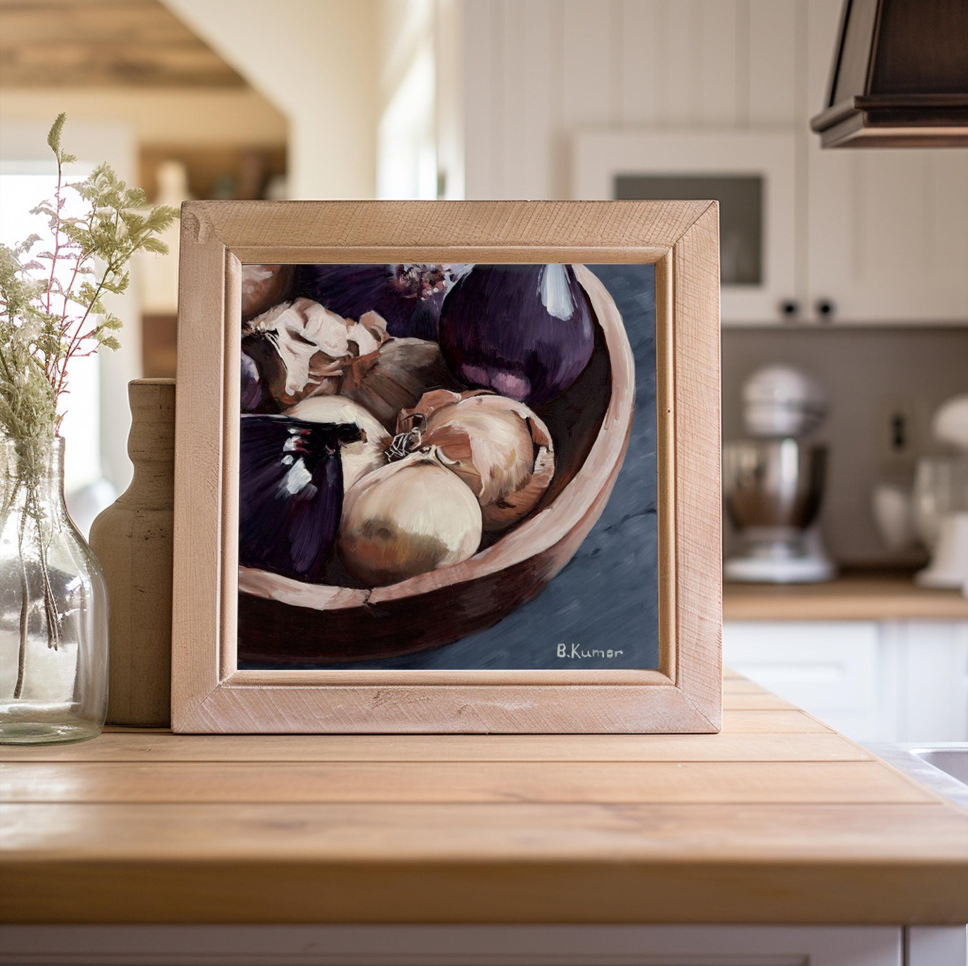 This "Bowl of Onions" print is a reproduction of the original oil painting from my Produce series, which celebrates the everyday ingredients that quietly support so much of what we cook and share. I was drawn to the shine on the purple onions and how it contrasts with the crisp, papery skins of the yellow ones, and also to the challenge presented by those papery skins.
